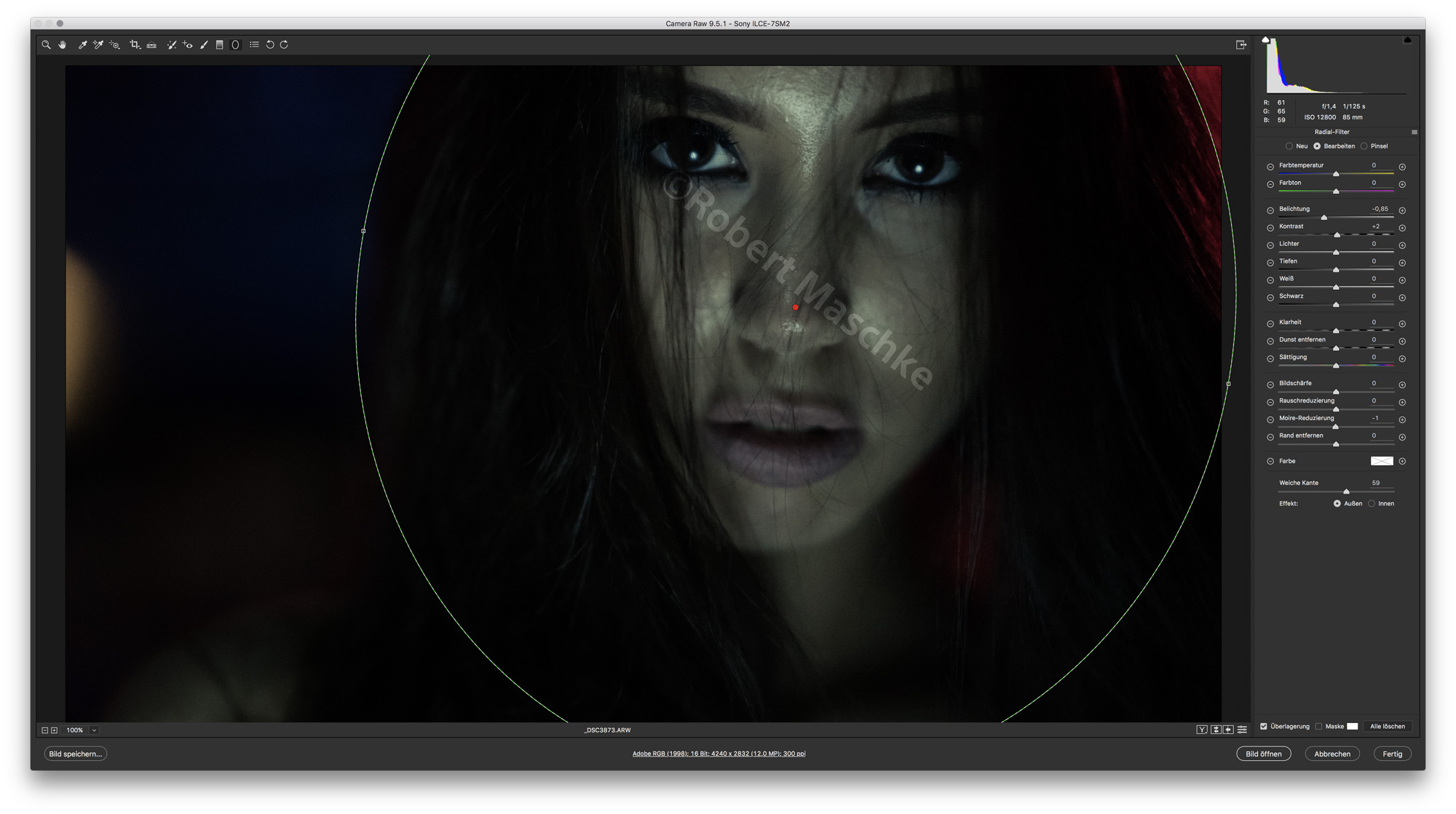 Sind die Augen sauber maskiert, senkt Robert die Belichtung des Gesichts weiter ab und hellt die Tiefen in den Augen auf. Das betont sie besonders. Gerade bei dieser Funktion ist Fingerspitzengefühl gefragt, damit das Model seinen natürlichen Touch behält – keine „Zombie-Augen“.