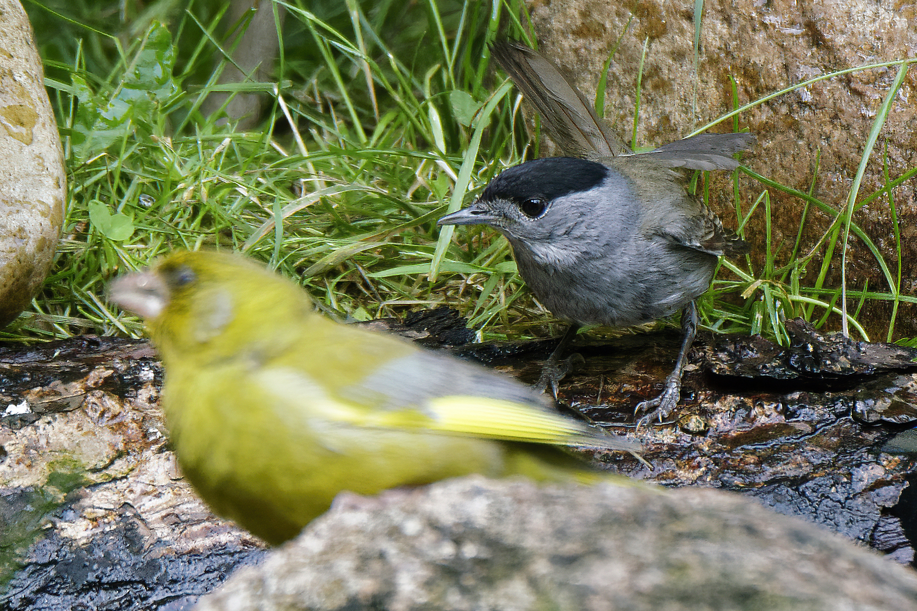 Mönchsgrasmücke Part 4 / Ein Männchen der Mönchsgrasmücke, es ist an seiner schwarze Kappe zuerkennen. Das Weibchen hingegen trägt eine rotbraune Kappe. In Bildvordergrund ist ein Grünfink Männchen zuerkennen